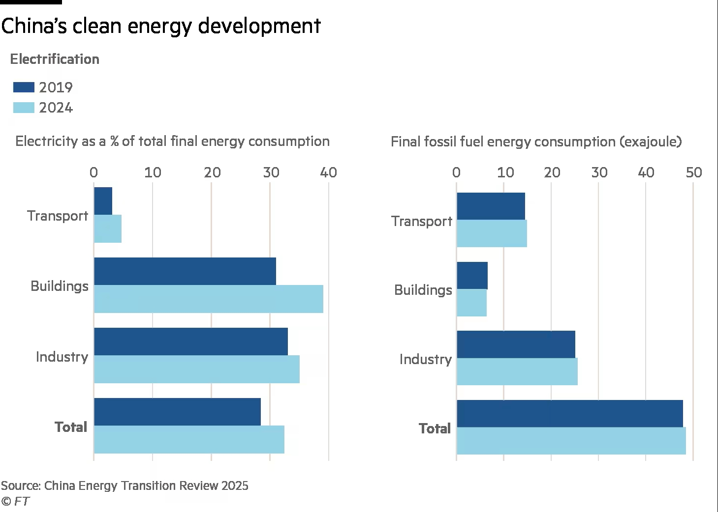 Bu strateji, Çin’in küresel üretimde lider konumunu temiz enerji çağına taşımasını sağlarken, petrol ve gaz ithalatına olan bağımlılığı azaltıyor ve ülkeyi uzun vadeli bir enerji egemenliği pozisyonuna yerleştiriyor. 2023 itibarıyla Çin’de elektrifikasyon oranı %32’ye ulaşmış ve yıllık yaklaşık bir puan artış gösteriyor. Avrupa ve ABD’de ise bu oran son on yılda duraklamış durumda.