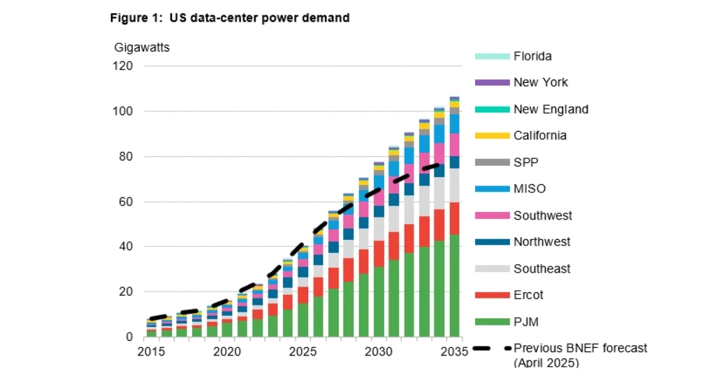 Yeni bir rapor, küresel ölçekte hızla artan veri merkezi inşaatlarının önümüzdeki on yılda ABD’de enerji talebini dramatik biçimde yukarı çekeceğini ortaya koyuyor. BloombergNEF tarafından yayımlanan analiz, 2035’e gelindiğinde veri merkezlerinin toplam 106 GW elektrik çekeceğini, bunun da günümüzdeki 40 GW seviyesinin yaklaşık 2,7 katı olduğunu belirtiyor.